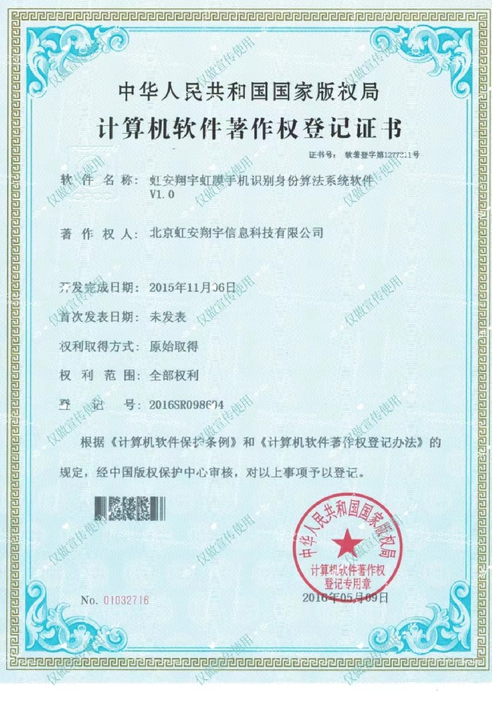 虹安翔宇虹膜手机识别身份算法系统软件V1.0